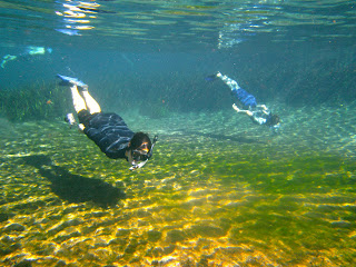 On Sunday morning (after a much needed good night of sleep and lots of rain), we drove to Blue Grotto, very close to Devil's Den where we dove on Saturday morning. There were a surprising number of divers for the pouring rain and chilly 45-50 degree temperatures, but we managed to beat the crowds and get in a beautiful dive before leaving for the Rainbow River drift dive at 10:30. We even saw 2 little turtles, the huge catfish that hangs out under the steps, and stuck our heads up in the bell to talk to each other at 30 feet underwater.